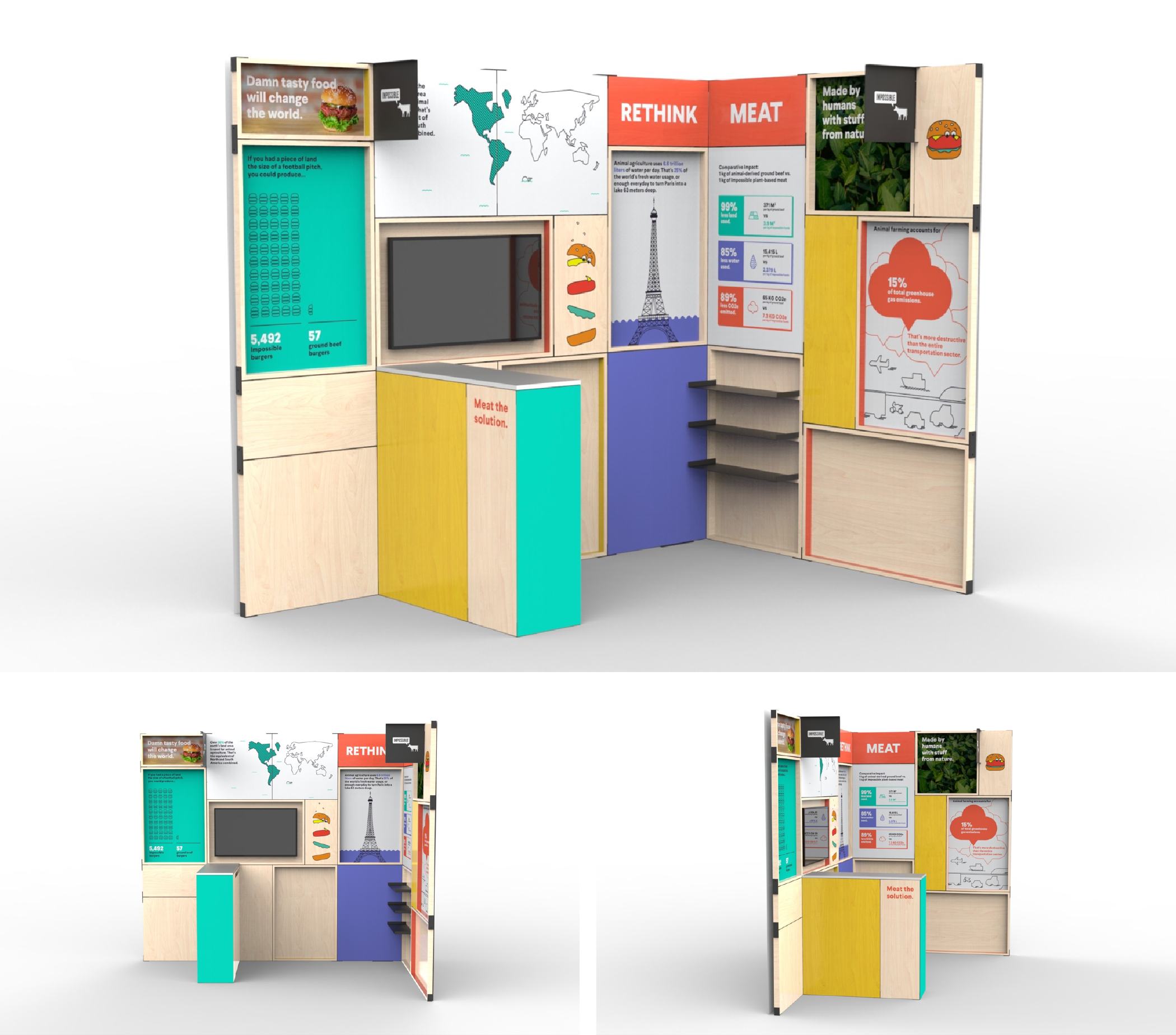 This booth was designed to educate Impossible Foods' audiences about its brand, mission, and product at SIF 2015 Conference. The design team’s mission is to make it stand out among other booths while maintaining its substantiality and authenticity.